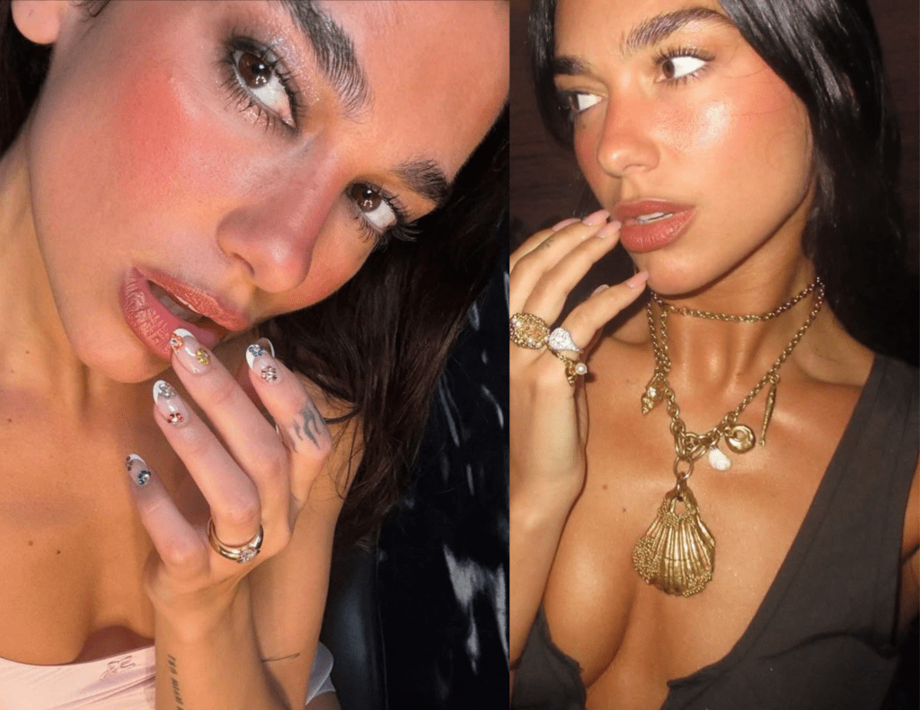 O blush aplicado de forma estratégica é um dos truques mais comentados das últimas temporadas. Inspirada no visual de Dua Lipa, a técnica leva o produto para o alto das maçãs do rosto e também para o topo do nariz.