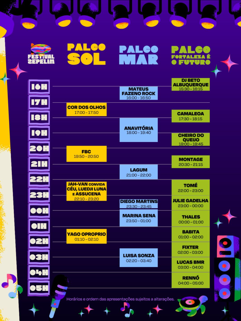 Tudo isso dividido entre os palcos Sol e Mar, garantindo som ininterrupto das 14h até o amanhecer.