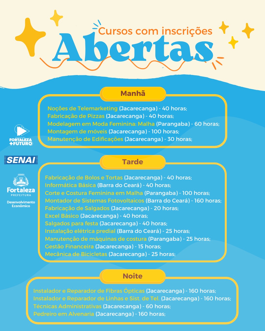 Além da plataforma on-line, os interessados podem ir a sede da SDE, nas unidades do Sine Municipal (Aldeota, Otávio Bonfim, Parquelândia e Siqueira), sempre das 8h às 12h e das 13h às 17h. As aulas serão ministradas nas unidades do Senac Ceará e do Senai Ceará, além de equipamentos da SDE, e ao final do curso os alunos recebem certificado gratuito. Participe!