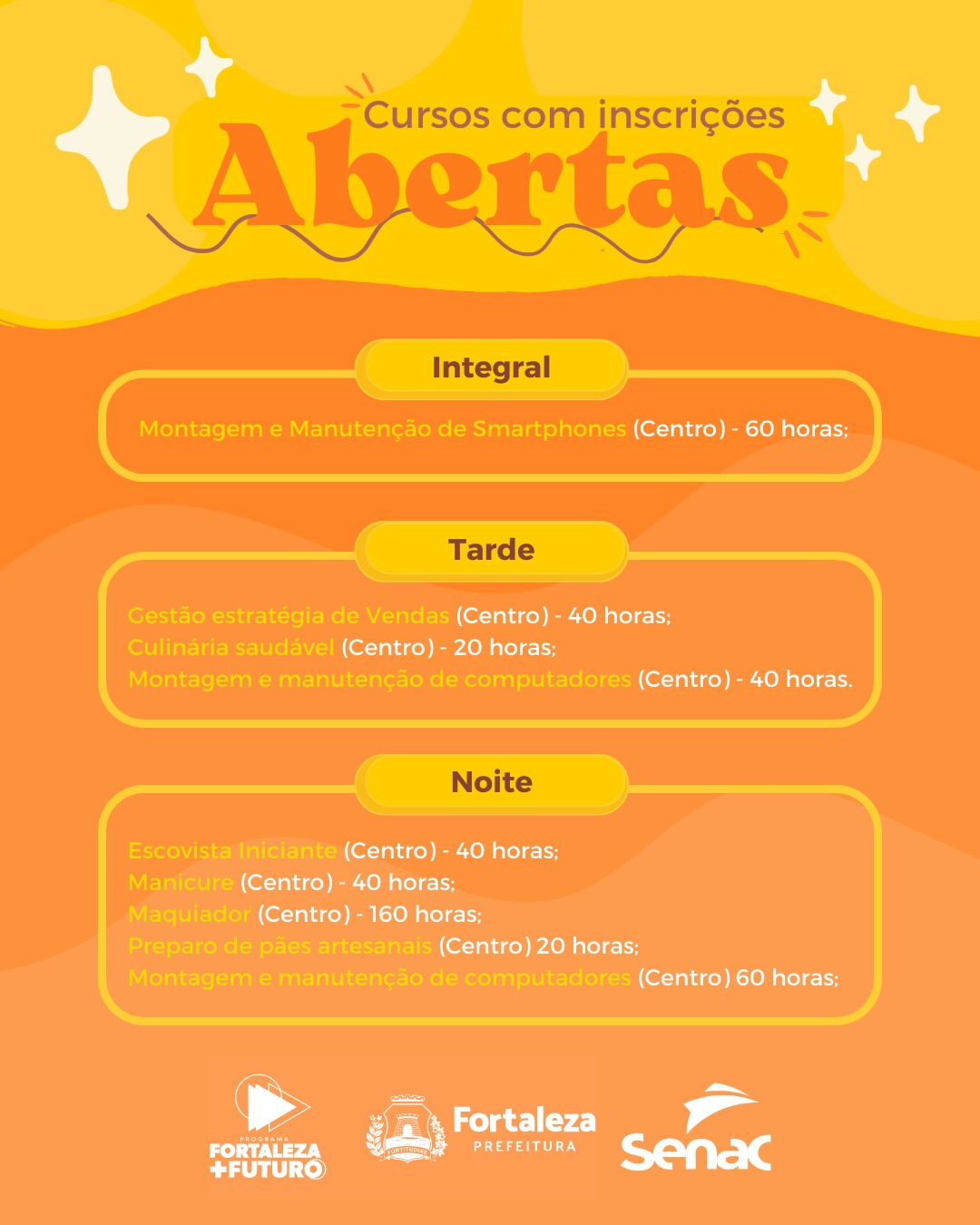 Já estão abertas as novas inscrições para os cursos profissionalizantes do Programa Fortaleza + Futuro! Em parceria com o Senac/CE e com o Senai/CE, estão sendo ofertadas, gratuitamente, 635 vagas para cursos em diversas áreas como moda, gastronomia, saúde, beleza, gestão e tecnologia da informação.
