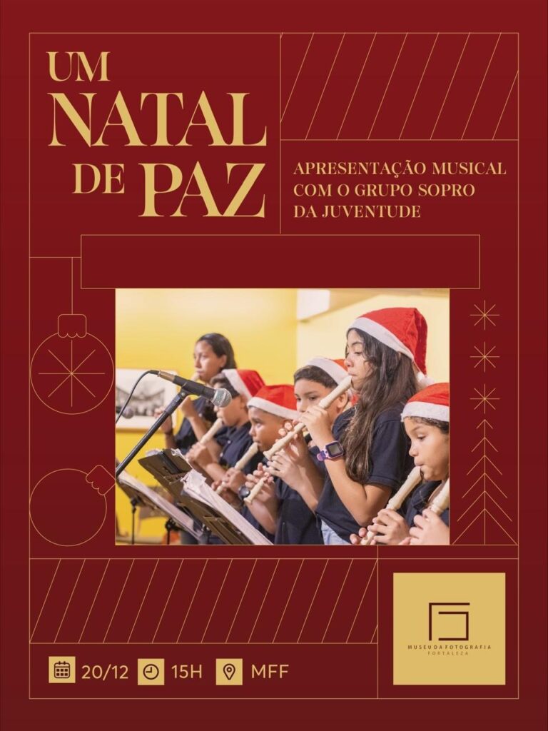 Ainda no sábado à tarde, o clima de Natal toma conta do MFF com a apresentação “Um Natal de Paz”, do Grupo Sopro da Juventude, formado por jovens do projeto Pupilos da Arte, do Centro de Promoção Cultural e Vivência Ecológica (CEPEVIVE). O concerto reúne um repertório natalino executado por instrumentos de sopro e celebra os 25 anos de atuação da instituição, que desenvolve ações de cultura, cidadania e educação ambiental junto a crianças e jovens de Caucaia.