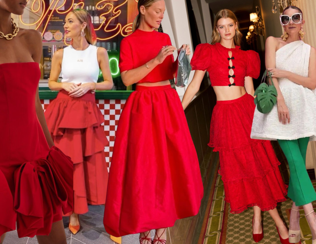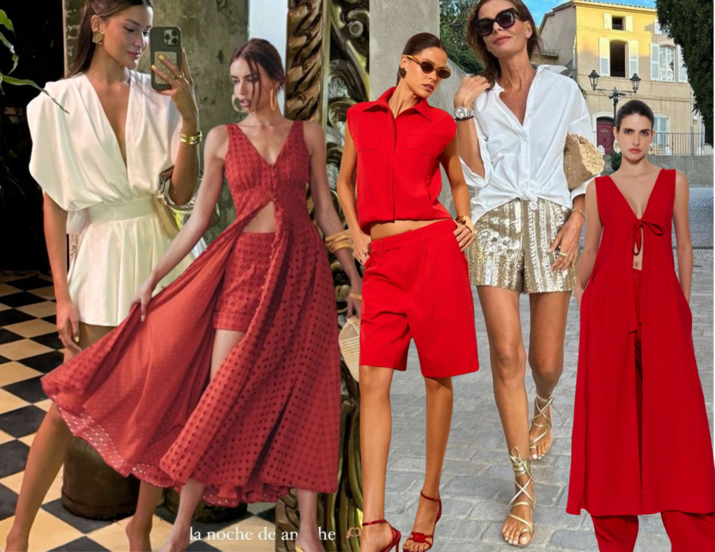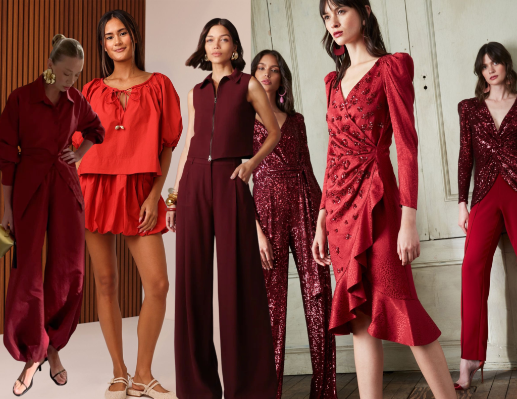 O vermelho continua sendo o protagonista do Natal, só que aparece mais sofisticado. Tons como cereja, tomate e vinho ganham espaço no lugar do vermelho clássico aberto. As modelagens também fazem diferença: vestidos midi fluidos, conjuntos modernos e peças de alfaiataria leve deixam o visual atual e elegante sem esforço.