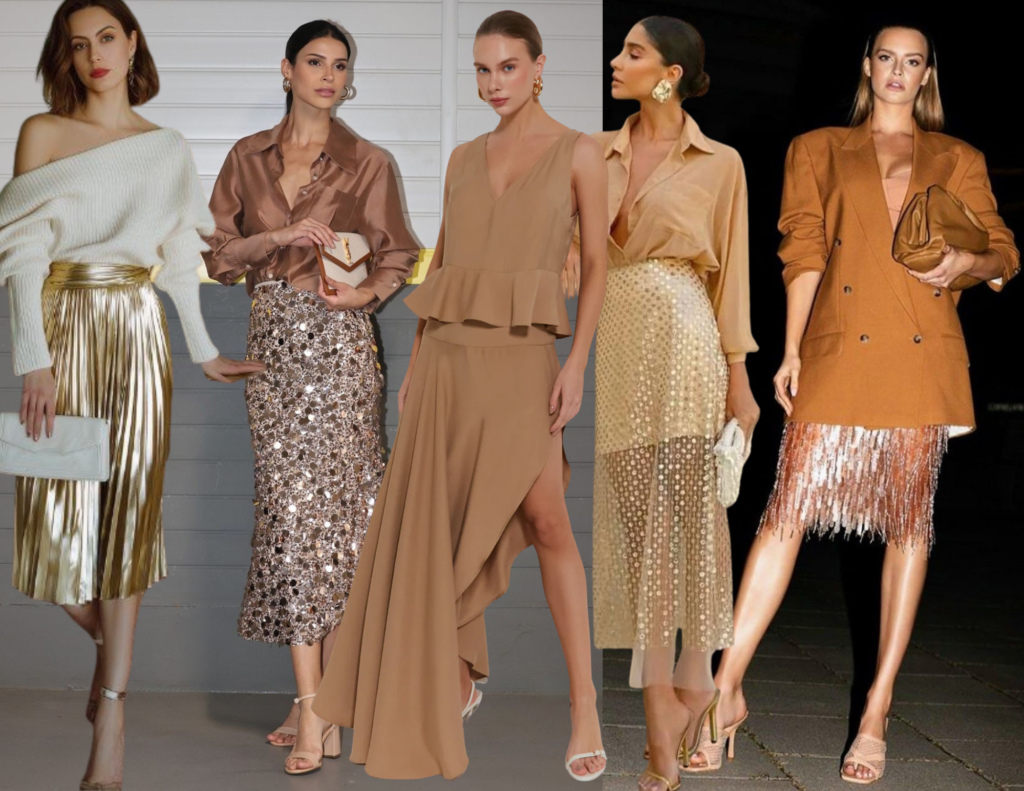 Quem prefere uma vibe mais minimalista pode apostar nos neutros elegantes. Tons terrosos do bege ao marrom surgem como alternativa aos clássicos natalinos e entregam um visual chic e versátil. Esses looks são perfeitos pra quem quer destacar o design da peça em vez da cor, com uma estética contemporânea e super refinada.