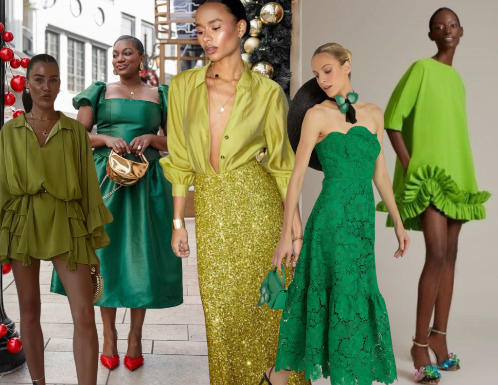 O verde segue como tom essencial na paleta de verão, trazendo frescor e personalidade aos looks natalinos. Vestidos de um ombro só, macaquinhos leves e peças em cetim ou tecidos fluidos se destacam e ficam ainda mais elegantes quando complementadas por acessórios dourados ou metalizados.