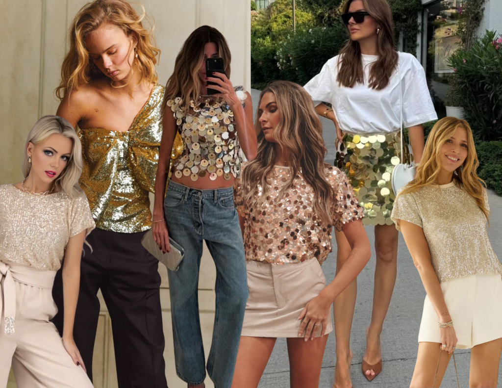Sim, o paetê continua firme e forte, mas agora com uma proposta mais versátil. Ele deixa de ser exclusivo do vestido festa e aparece combinado com peças simples, como regatas, camisetas ou camisas leves. O contraste cria um look moderno, atual e com muita personalidade.