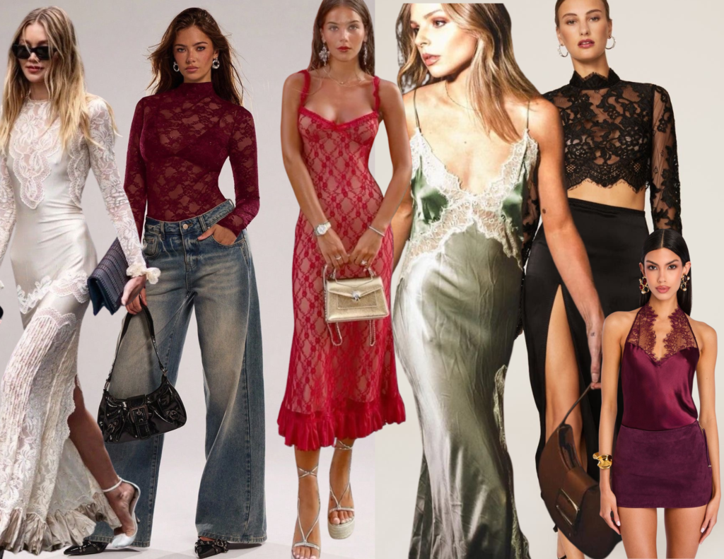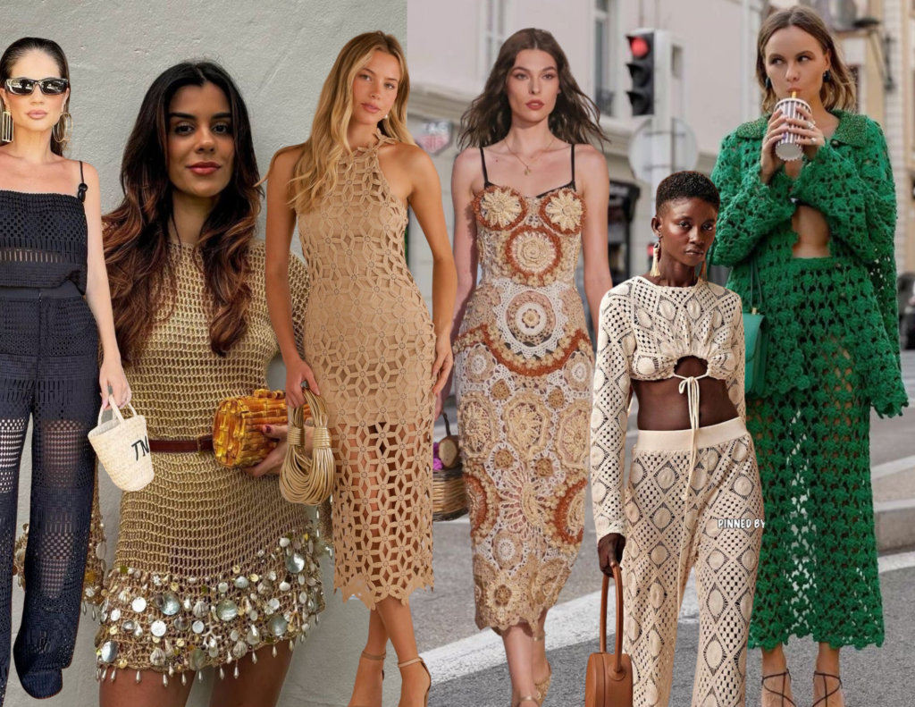 Crochê, renda, tricô leve e materiais que lembram o feito à mão estão com tudo na temporada. Essas peças trazem profundidade visual, sensação de frescor e um charme artesanal que funciona super bem para o clima de dezembro. Seja em blusas, saias ou vestidos, elas criam looks cheios de personalidade que vão do almoço elegante à festa descontraída depois da ceia!