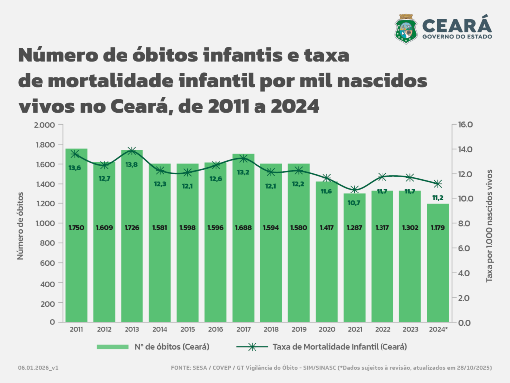 Hoje trazemos boas notícias para a saúde do povo cearense. Isto porque o Ceará reduziu em 17,6% a taxa de mortalidade infantil (TMI) entre 2011 e 2024, de acordo com dados do Boletim Epidemiológico Mortalidade Infantil e Fetal da Secretaria da Saúde do Ceará (Sesa)!