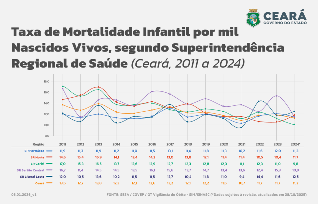 Na distribuição regional do número de óbitos e da TMI por mil nascidos vivos, observa-se que, no ano de 2024, a menor taxa foi na Superintendência Regional de Saúde (SR) Cariri (9,8%) e a maior na SR Litoral Leste (12,5%).