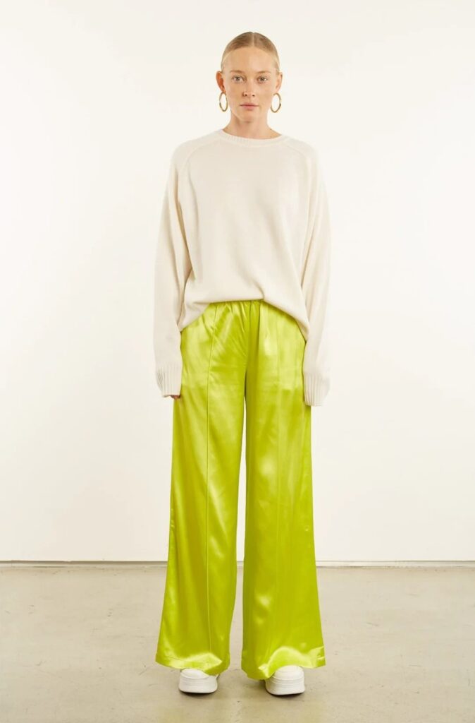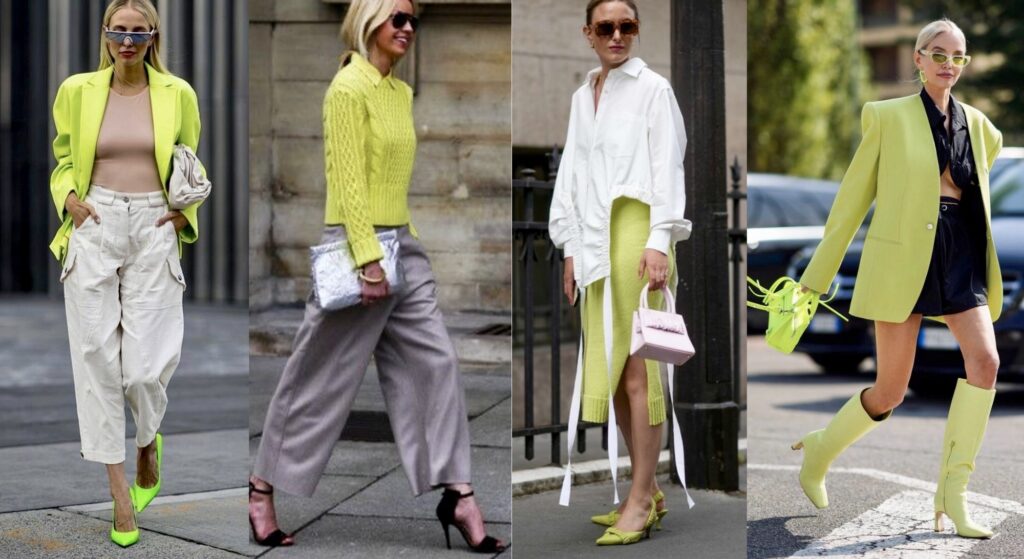 Em peças maiores, priorize cortes de alfaiataria suave. Um blazer chartreuse com calça reta off-white cria contraste chique. Saias midi em tecidos encorpados equilibram a vibração da cor. Se a peça for fluida, como uma camisa acetinada, complemente com uma base mais estruturada para adicionar leitura sofisticada.